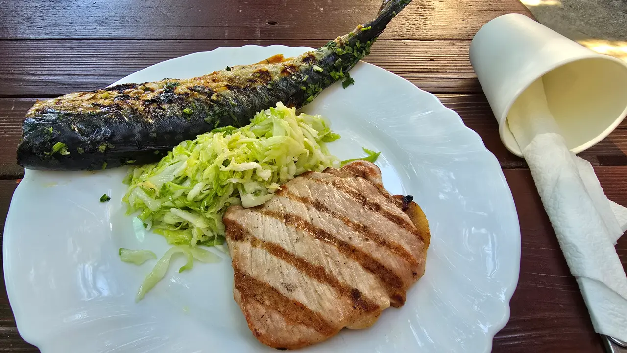 Shortly before 2 PM, we reached the bay on Katina. The crew we had dropped off earlier had prepared a barbecue lunch with a menu of mackerel, pork chops, and salad. For those who were extra hungry, a second serving was provided.