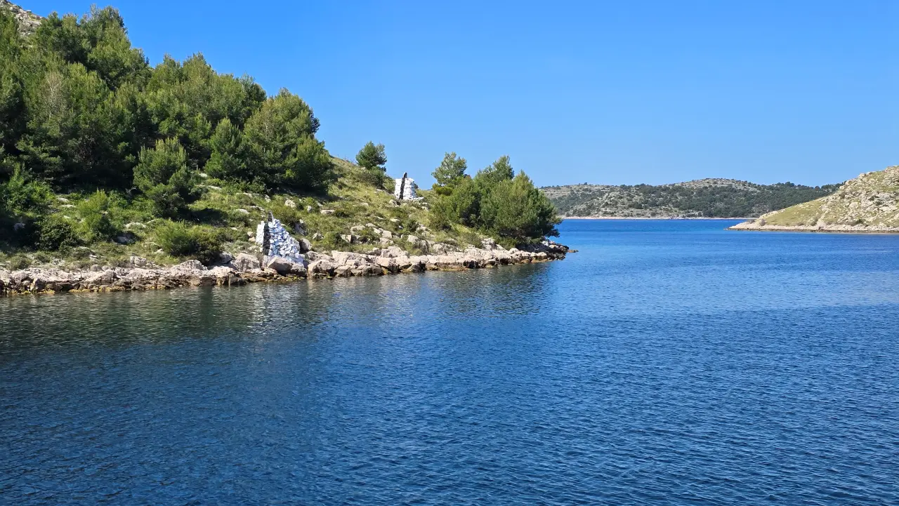 At 10:30 AM, we passed the narrow channel between Island Kornat (to our left) and Island Katina. The ship slowed down as the depth was only about 2 meters. On the shore, there were two white stone pyramids used for navigation through the channel.